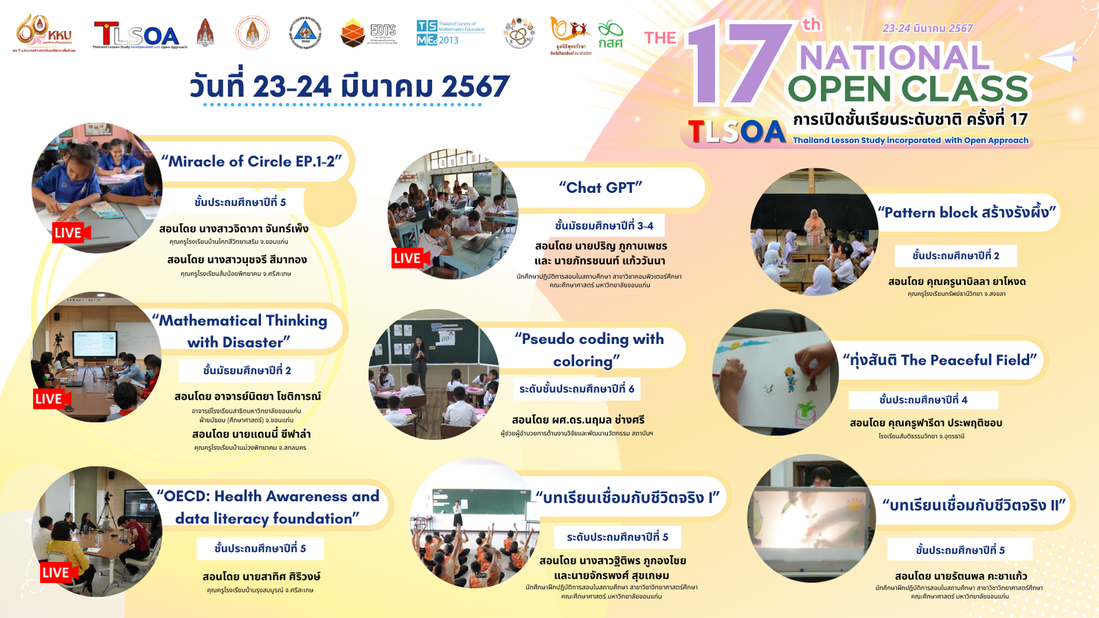 การจัดกิจกรรมเปิดชั้นเรียนระดับชาติ ครั้งที่ 17 ระหว่างวันที่ 23 – 24 มีนาคม 2567 ในรูปแบบ Hybrid ณ สถาบันวิจัยและพัฒนาวิชาชีพครูสำหรับอาเซียน มหาวิทยาลัยขอนแก่น และระบบออนไลน์ โดยการเปิดชั้นเรียนมีทั้งหมด 8 ชั้นเรียน ประกอบไปด้วย